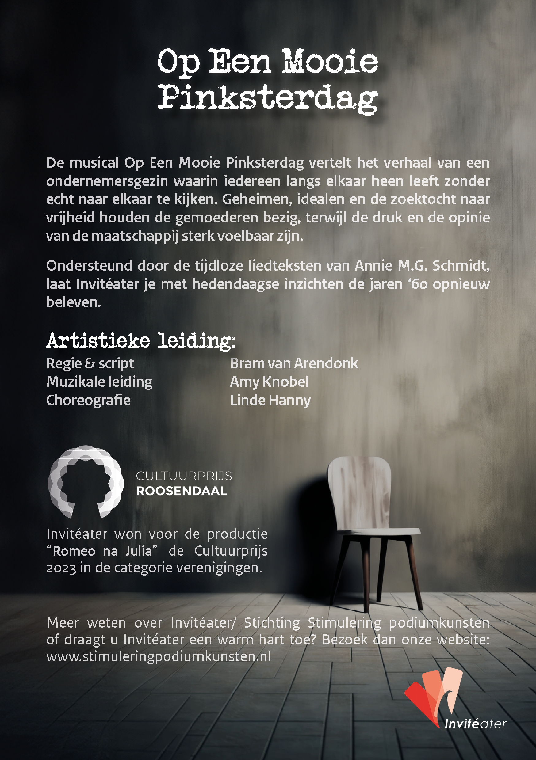 Op Een Mooie Pinksterdag Op 31 oktober, 1 en 2 november brengt een groep van ca. 37 spelers, muzikanten, artistiek- en productieteam de musical Op Een Mooie Pinksterdag ten tonele in de kleine zaal van Schouwburg De Kring in Roosendaal. Aanvang van alle voorstellingen is om 20.15 uur.